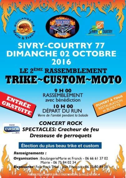 Après la première édition, la seconde. Le 2ème rassemblement Trikes, Motos et Kustoms aura lieu le 2 octobre 2016, à Sivry-Courtry, 77.