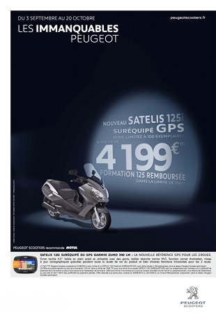 Pour le Satelis 125cc, Peugeot Scooters propose un scooter au tarif habituel avec en sur-équipement un Gps Garmin Zumo 340LM, modèle spécial deux roues. Le Satelis 125cc est au tarif de 4.199€.