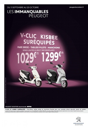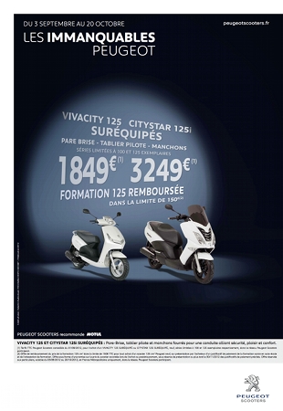 Passe de trois chez Peugeot Scooters. En effet, ce sont pas moins de trois offres que la marque au lion propose pour cet automne. Sont concernés le Satelis 125cc, le Citystar 125cc, le Vivacity, le Kisbee et le V-Clic. Des 125cc et des 50cc, qui en deviennent sur-équipés.