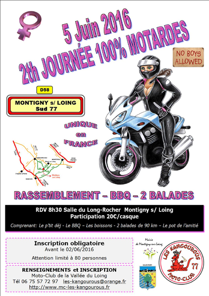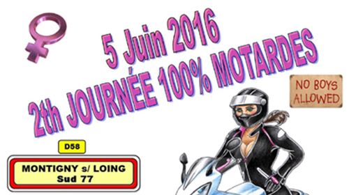 Le 05 juin prochain, les motos se déclineront au féminin et les hommes resteront à la maison ! En effet, le Moto Club de la Vallée du Loing organise une journée 100% dédiée aux motardes. Les passagères ne seront acceptées que derrière une pilote. Seul l’encadrement sera fait par les membres masculins du Moto Club de la Vallée du Loing.