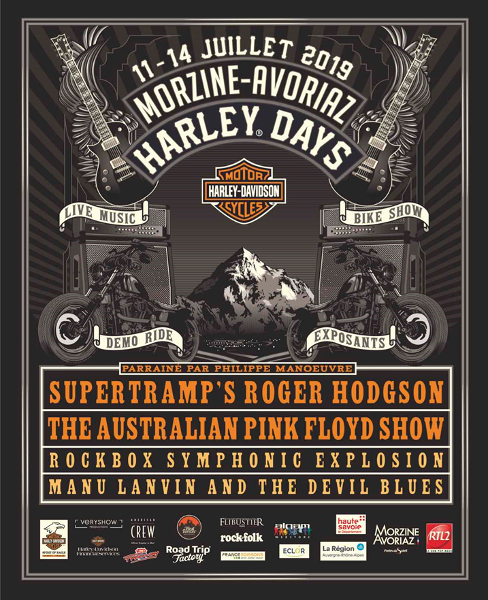 Cette année, affiche rock puisque le festival Morzine-Avoriaz Harley Days accueille les groupes mythiques Supertramp’s Roger Hodgson, The Australian Pink Floyd Show, Manu Lanvin & THE DEVIL BLUES et ROCKBOX Symphonic Explosion.