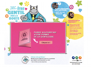 Action et engagement : invitation à passer son Permis de la Gentillesse (application quiz humoristique) et à afficher sur sa voiture un autocollant du Chat de Philippe Geluck « Gentil et fier de l’être » disponible dans les agences MMA.