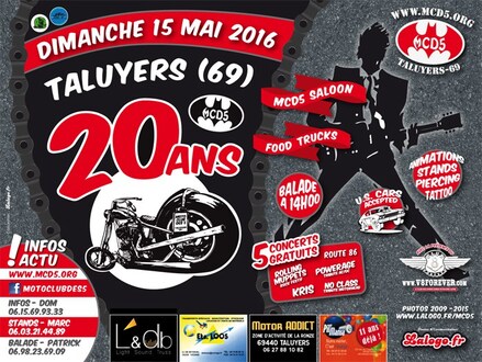 Ce dimanche 15 mai marquera le vingtième anniversaire de la concentration motos de Talyers, près de Lyon avec au programme, plus de rock, plus de fêtes, plus de burns, plus de folies !