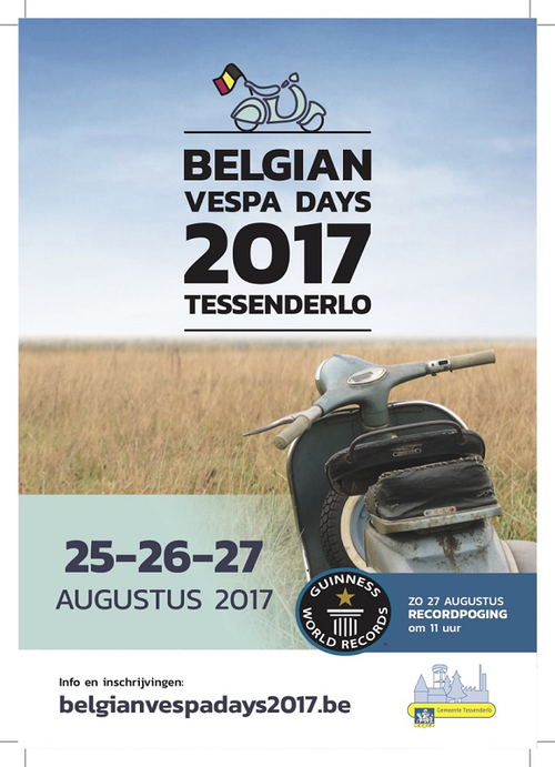 En Belgique, le pays est plat mais les Belgian Vespa Days, c’est le point culminant pour chaque amateur de Vespa belge. En 2017, le Vespa Club Tessenderlo organisera cet événement grandiose. Pendant le week-end du vendredi 25, samedi 26 et dimanche 27 août, tous les Vespistes sont les bienvenus à Tessenderlo. La Vespa parade du dimanche sera le moment suprême, car nous essaierons d’obtenir une place dans le Livre Guinness des records en créant la parade la plus longue.