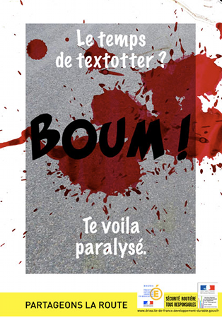 J’ai ici créé une suite d’affiches sur le même modèle d’efficacité : question (action potentiellement effectuée par le conducteur) + onomatopée (bruit de l’accident) + conséquence de l’inattention qui rime avec la question. La tache de sang est un fort symbole pour éviter une dédramatisation liée à la typographie style BD. J’ai associé une tache de sang façon "Tarantino" avec des slogans basés sur des faits réels, ce qui donne un dynamisme et du réalisme à la campagne. L’aspect "trash" attire l’œil, particulièrement celui des jeunes.
