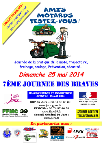 Dans le cadre du Plan Départementale d’Action de Sécurité Routière 2014 et sous l’autorité du préfet, la coordination Sécurité Routière, la FFMC39 ainsi que de nombreux partenaires (forces de l’Ordre, professionnels, inspecteurs des permis), organisent une action d’envergure à destination des MOTARDS.