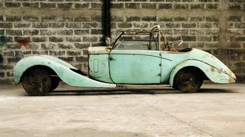 La carrosserie présentée est attribuée à GANGLOFF. Ce cabriolet très élégant a été la propriété de F. Henry Berlin. On retrouve cette voiture à Madrid en Espagne au début des années 60. Cette carrosserie est en strict état d’origine, de couleur vert pâle et comporte la partie centrale avec le pare-brise, l’arceau de capote et les sièges avant et arrière, les quatre ailes (les ailes avant comportent les phares, les clignotants et les grilles) ainsi que le pare choc avant, les marche pieds et la plaque d’immatriculation d’époque PM 4283.