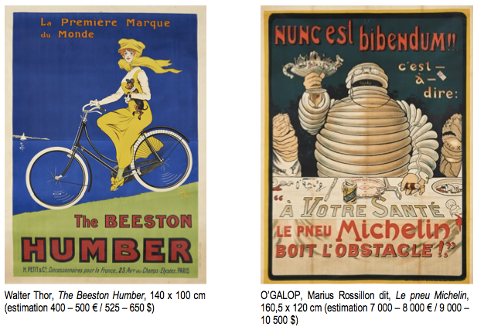 Des affiches publicitaires seront aussi proposées, avec une section dédiée à celles créées pour la promotion de l’entreprise Michelin. On remarquera la très célèbre Nunc est Bibendum, qui fit la renommée de la marque et qui sera proposée dans deux formats différents, le plus grand (160 x 120 cm) étant estimé entre 7000 - 8000 € / 9 000 – 10 500 $.