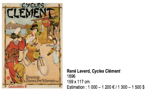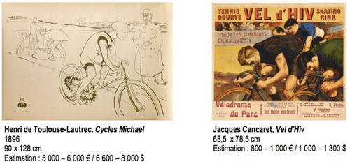Parmi les lots les plus emblématiques de la vacation, il faut retenir une très belle affiche de Henri de Toulouse-Lautrec (1864 - 1901), Cycles Michael – 1896, provenant de l’ancienne Collection Petiet (estimation : 5000 - 6000 € / 6 600 – 8 000 $) ainsi qu’une affiche d’Henri Thiriet (1873 - 1946), Dayton cycles - tentation suprême, spectaculaire par sa taille : 159 x 228 cm (estimation : 600 - 800 € / 800 – 1 000 $).