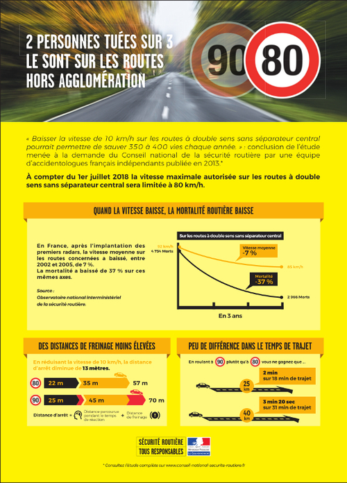 Du samedi 17 février au mardi 20 mars 2018 une grande campagne pédagogique sera diffusée dans plus de 300 supports de la presse quotidienne nationale, régionale, hebdomadaire, télévisuelle et de la presse féminine pour délivrer un message clair et des informations expertisées. L’objectif de cette double page est de montrer aux Français pourquoi il est nécessaire de baisser la vitesse maximale autorisée à 80km/h sur les routes à double sens sans séparateur central, hors agglomérations, soit les routes dites "de campagne".