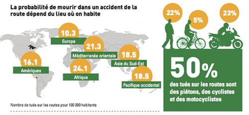 - 27% des tués sur les routes sont des piétons et des cyclistes. Dans certains pays, ce chiffre dépasse 75%, ce qui reflète les décennies durant lesquelles les politiques de transport ont favorisé les engins motorisés et négligé les besoins de ces usagers de la route.