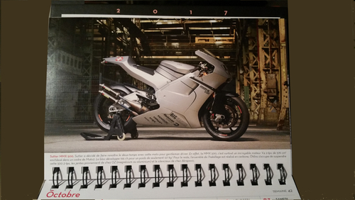 L’agenda se présente ainsi par semaine et une moto tient le dessus non pas du pavé mais de la semaine. Cette moto est accompagnée d’un commentaire resituant la moto, le pilote dans son contexte.