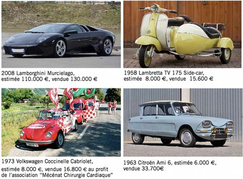 La Coccinelle Volkswagen à pois rouge ex-Caravane du Tour de France, vendue au profit de l’association “Mécénat Chirurgie Cardiaque", estimée 8000 euros, a été vendue 16 800 euros. La totalité du prix de la vente sera reversé par Artcurial Motorcars à l’association.