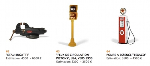 A côté de ces objets "conventionnels", vous en trouverez également d’autres beaucoup plus insolites comme cet étonnant étau signé Bugatti, une pompe à essence Texaco, ou l’oeuf d’éléphant !