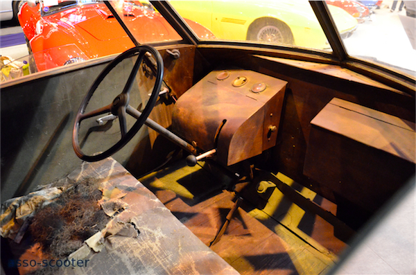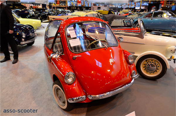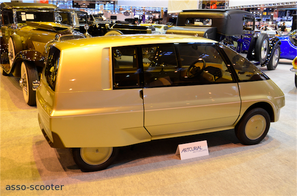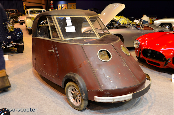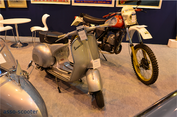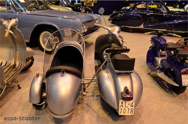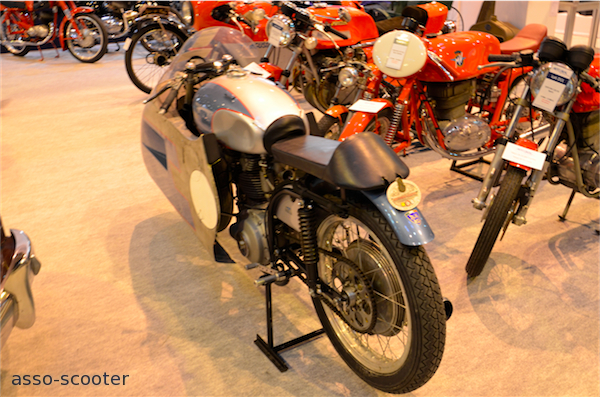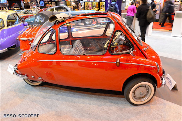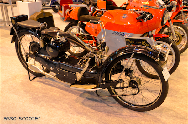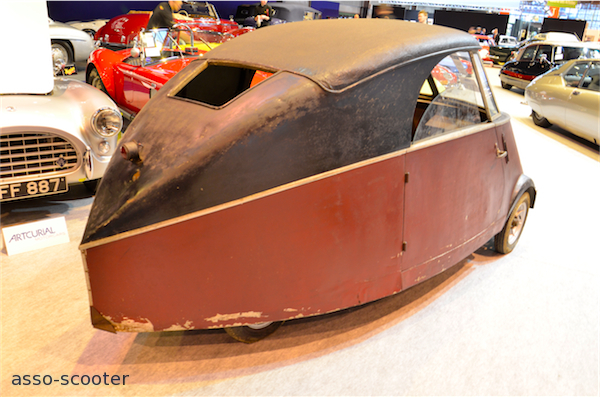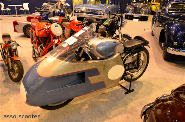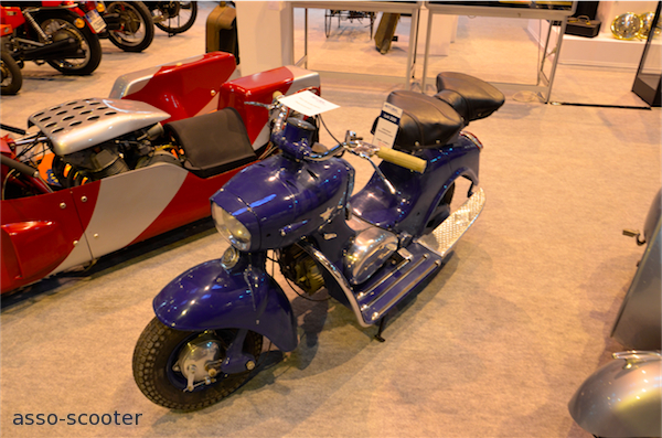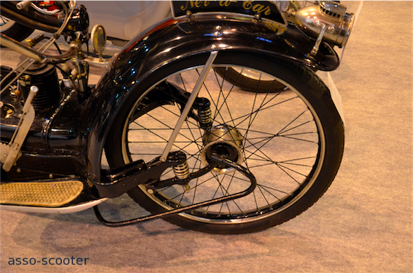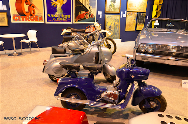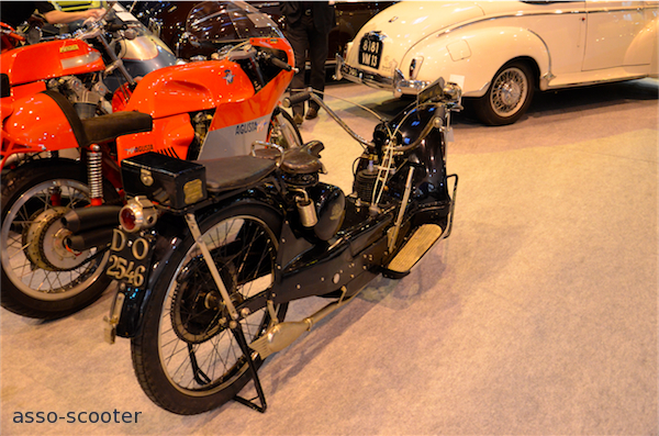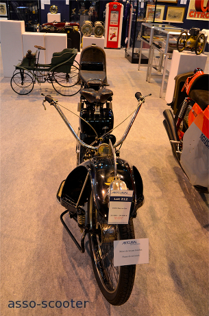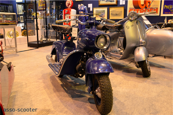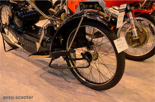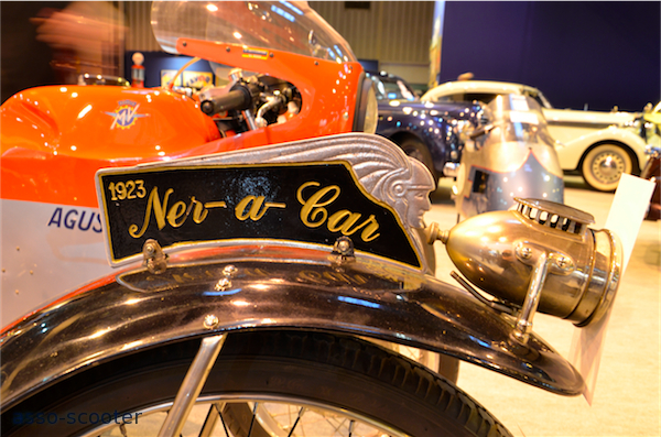Cette année, c’est sur le stand Artcurial que les deux roues étaient à voir. Des scooters, Vespa avec side-car, une Rumi, et une Ner-a-car. Fabriquée aux États-Unis et en Angleterre par Sheffield Simplex, sous licence entre 1921 et 1928, la Ner-a-car est considérée parfois comme l’ancêtre du scooter. Cet engin extrêmement original était assez avant-gardiste, avec son cadre périmétrique surbaissé et sa mécanique très largement carénée. Sa transmission par plateaux à friction était plus proche d’une technique cyclecar que motocycliste et la moto était propulsée par un monocylindre 220 cm3, puis 285 et même 350 cm3 en Angleterre. La direction est particulièrement soignée et sophistiquée.