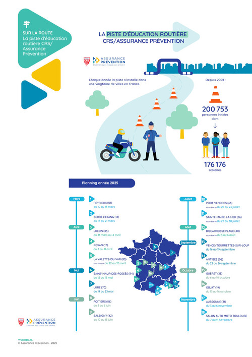 Une douzaine de moniteurs CRS, spécialistes de la sécurité routière, vont faire passer les messages qui sauvent. Pour sa tournée 2025, la piste CRS/Assurance Prévention recevra le public et les scolaires dans les villes suivantes :