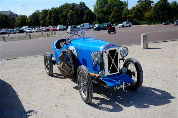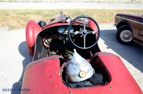 Les Cyclecars ont donc 4 roues et sont un cocktail voitures /motos très sportif. Légère et nerveuse cette Amilcar possède 2 places « décalées », avec le frein à main en extérieur !
