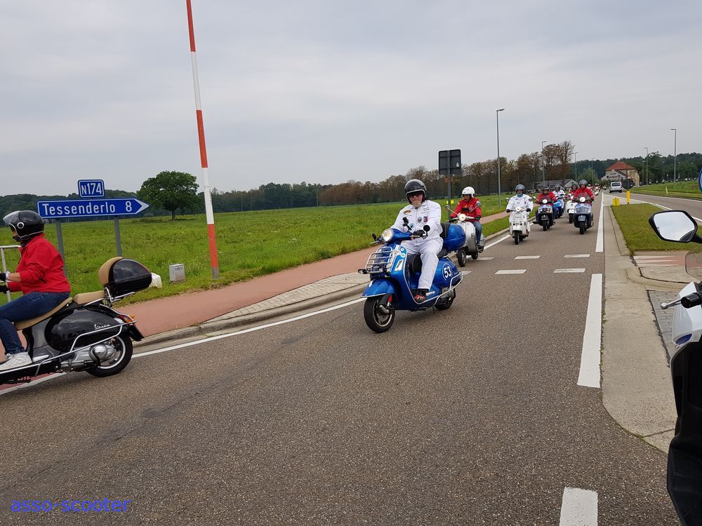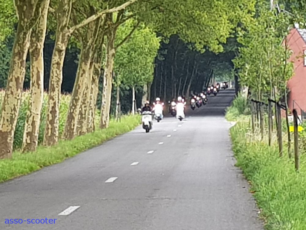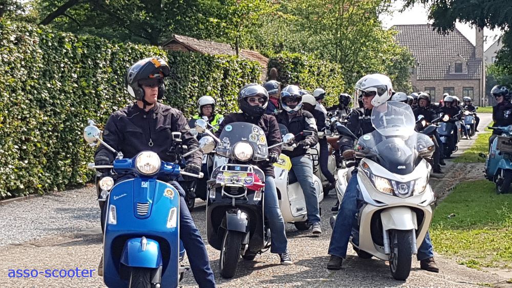 A Tessenderlo, il n’y a pas d’heure fixe pour le départ des balades. C’est entre 10h et 12h pour la première "Mooi Looi" et ses 38 kilomètres. C’est entre 14h et 17h30 pour la seconde, "Puur genieten", et ses 51km. Chacun, chaque club part quand bon lui semble. Le résultat est qu’il n’y a pas un flot ininterrompu de scooters, mais plutôt des vagues successives. Les capitaines de route font leur travail de sécurisation des cortèges et les vagues de scooters avancent tranquillement sans rupture de rythme. C’est un rythme de balade où la seule vitesse qui compte est celle qu’il faut à l’œil pour imprimer tous ces magnifiques paysages dans notre mémoire, à notre oreille pour enregistrer ici, un cheval qui hennit et entame un galop, là-bas, un groupe de cyclistes dont on entend les roues fendre l’air…