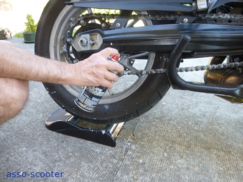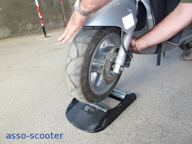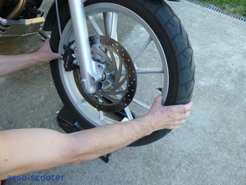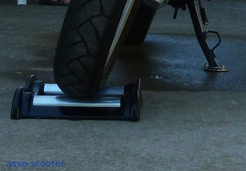 Dans notre élan, nous avons reproduit tout aussi facilement la même opération avec la roue avant pour un nettoyage en règle. Cette possibilité est bien apprécié , car même lorsque la moto ou le scooter est sur sa béquille centrale, il est difficile de soulever la roue avant.