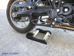 - relever la moto et la faire avancer doucement d’une vingtaine de centimètres de telle sorte que la roue arrière prenne place sur l’outil. Aucun effort n’est demandé pour cette manœuvre.