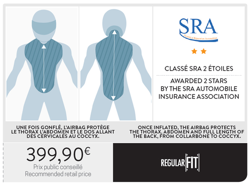 Certifié CE au CRITT* et possédant deux étoiles au SRA**, le C-PROTECT-AIR, une fois gonflé, protège le thorax, l’abdomen et le dos, des cervicales au coccyx.