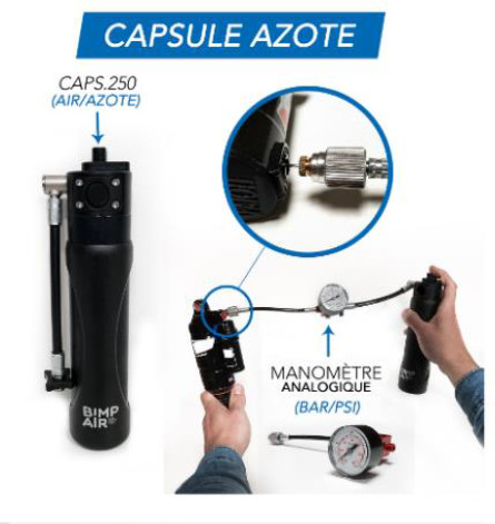 Pour régler par exemple la pression d’une suspension, une capsule BIMPAIR 250 chargée en air, 12,5 litres ou en azote, 17 litres. Elle dispose d’un tuyau rotatif 360° valve Schrader femelle, d’un bouton de gonflage, de dégonflage, d’une soupape de sécurité et d’un témoin de charge.