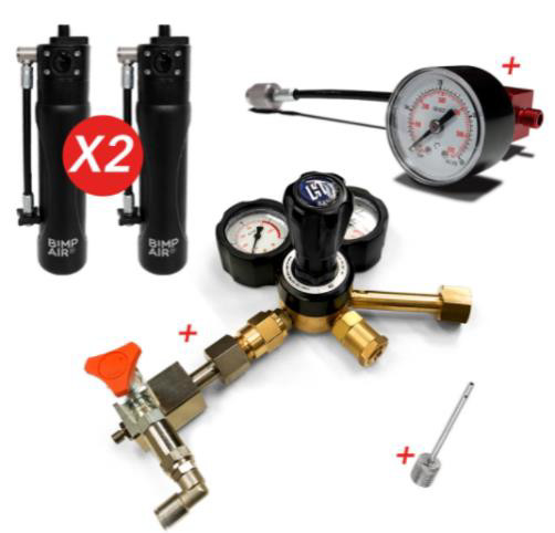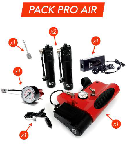 2. Le Pack Pro Air qui comprend deux Capsules BIMPAIR 250, un chargeur électrique EWAY, deux modes d’alimentation (prise 12V allume cigare et transformateur 12/220V), un manomètre analogique (bar/psi) et une aiguille.