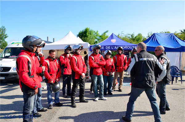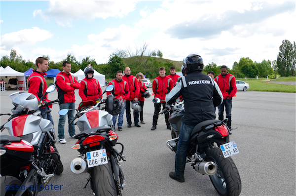 Normalement, ce type de stage est prévu sur un module d’une journée chez Team Formation, avec entre autre feinage en duo, roulage de nuit et sur le mouillé. Pour les besoins de la fondation Bmw, il a été concentré sur une demi-journée. Ce stage n’a pas pour but d’apprendre les techniques de conduite pour « passer » plus vite mais simplement d’apprendre les bases d’une conduite sécurisée.