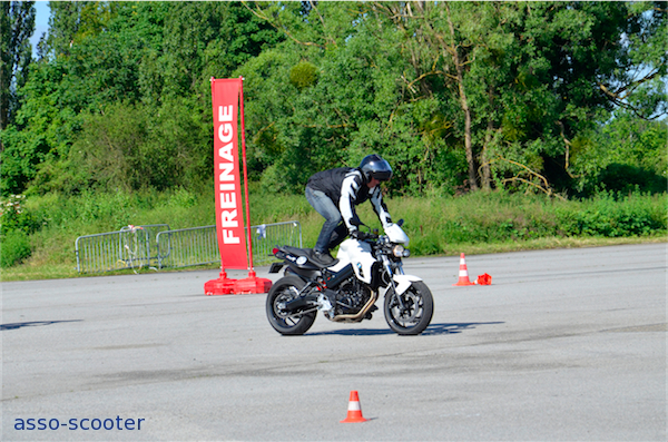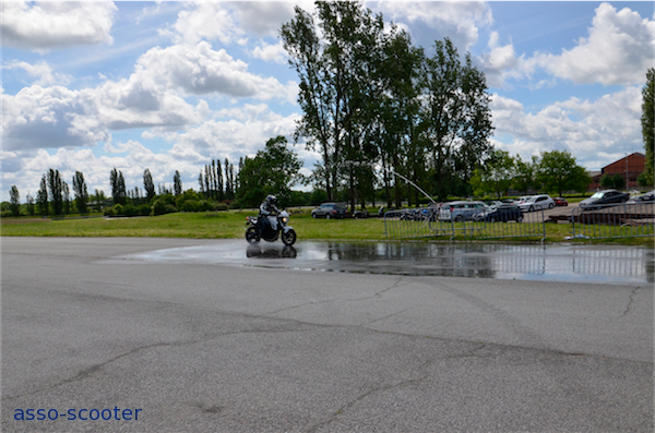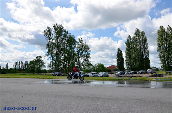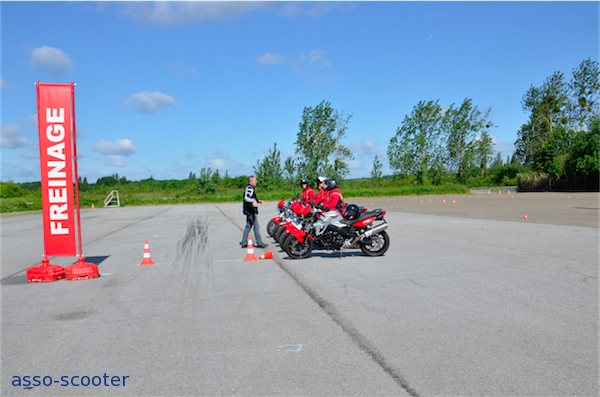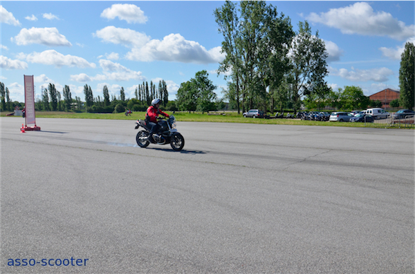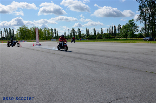 Enfin, dernière séquence de l’atelier, freinage avec les deux freins. Par rapport à la première partie de l’atelier, la distance d’arrêt est pratiquement de la moitié.