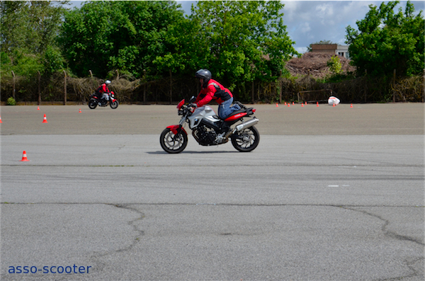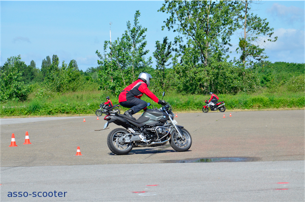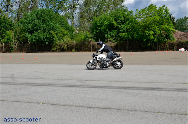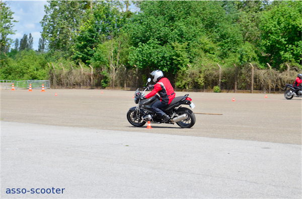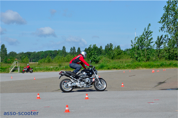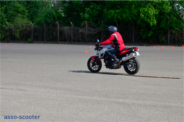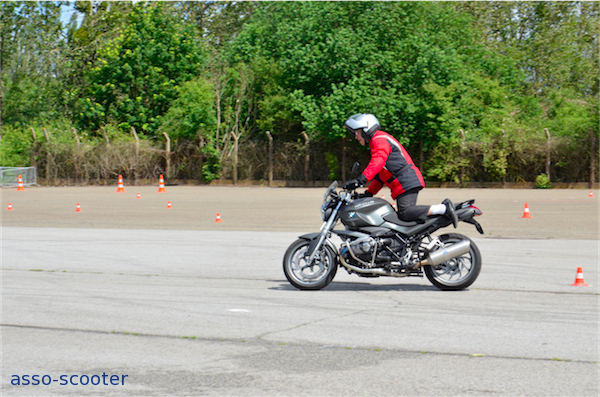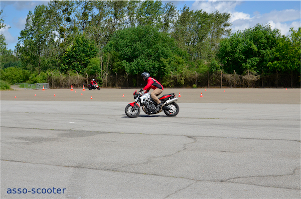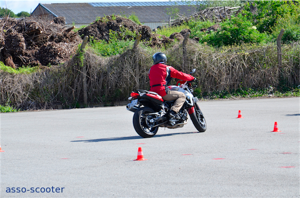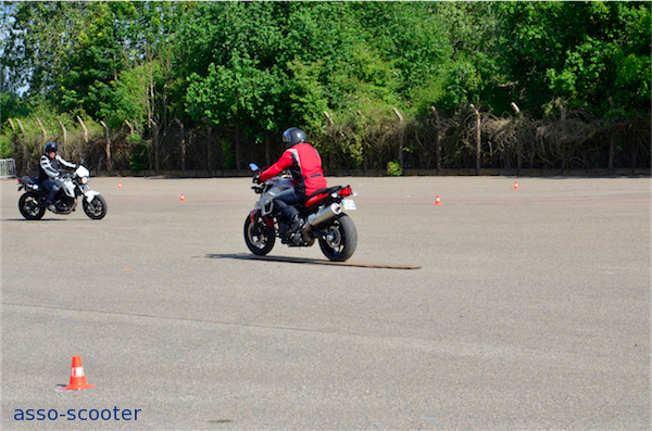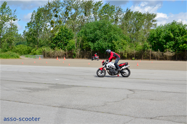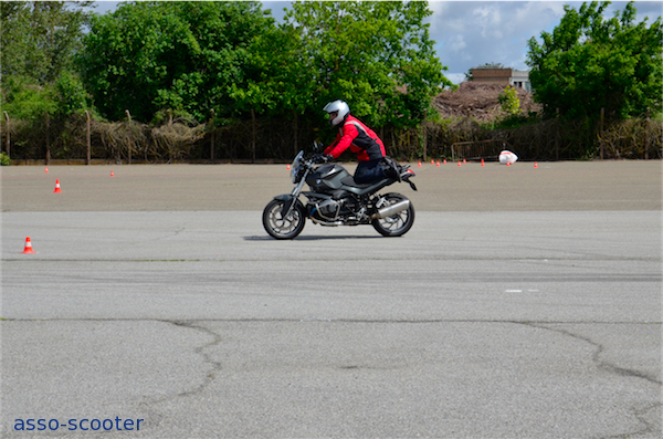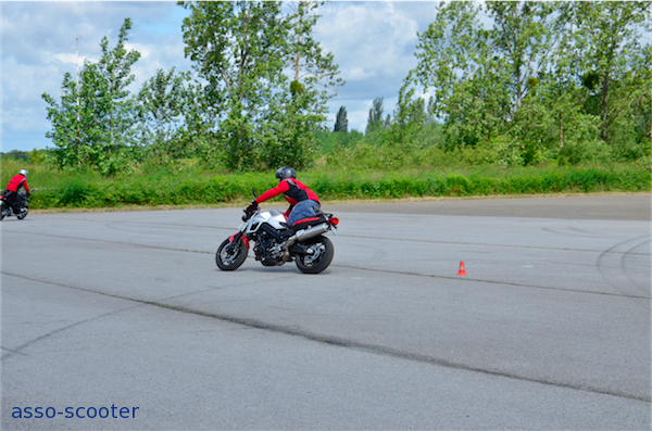 Les moniteurs sont là pour nous montrer qu’il est possible de s’aider du guidon et que la force gyroscopique fait que la moto se redressera toute seule à la fin de la manoeuvre.