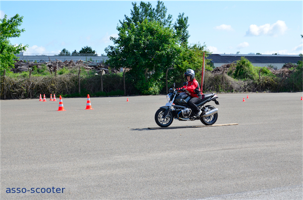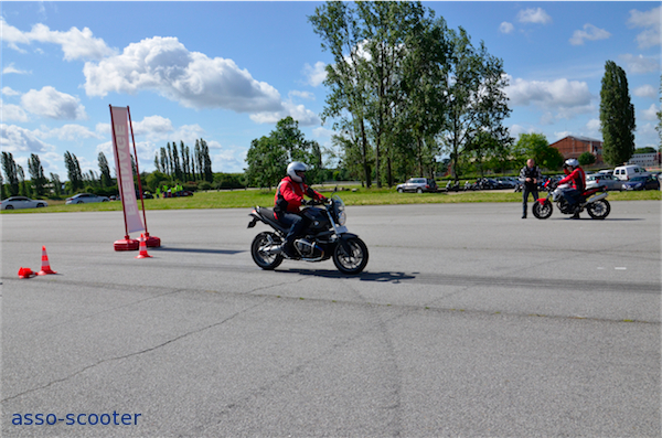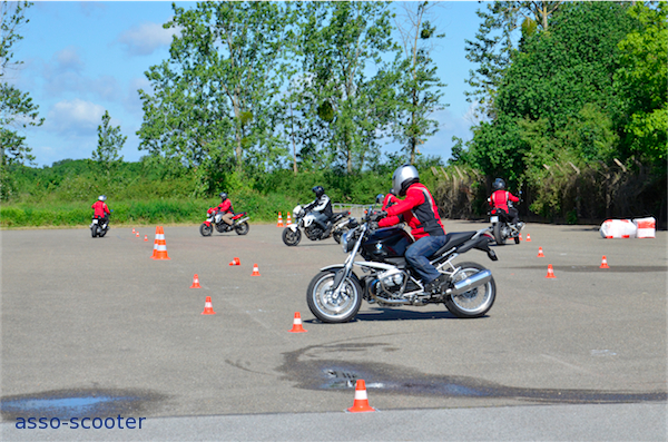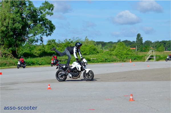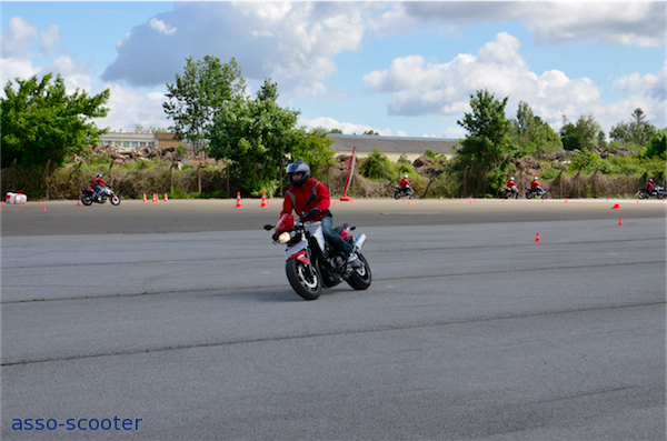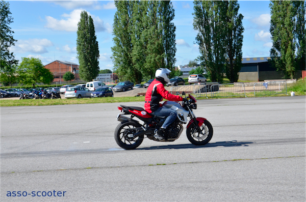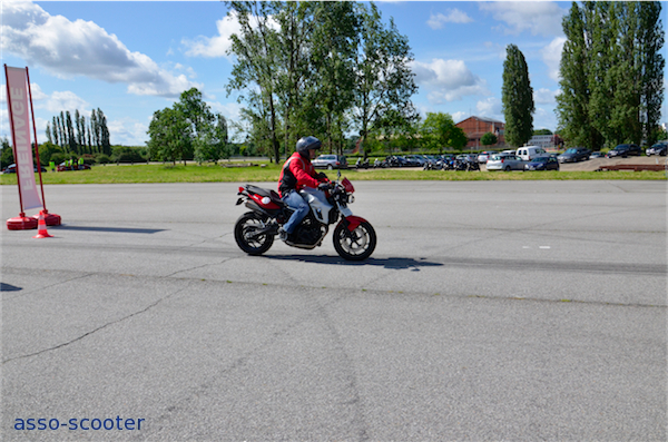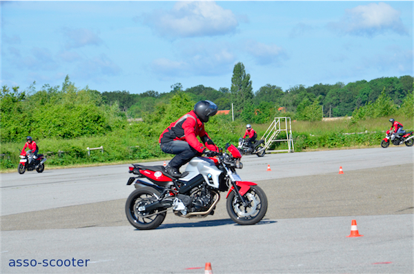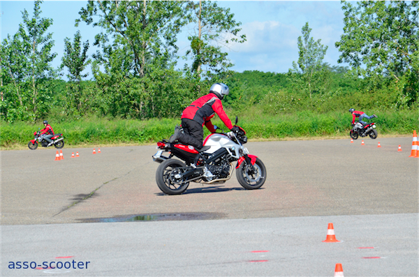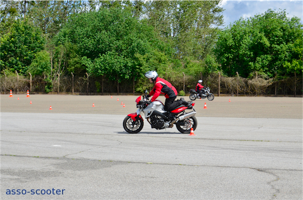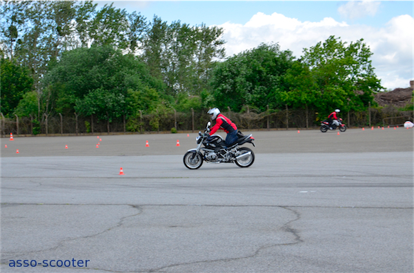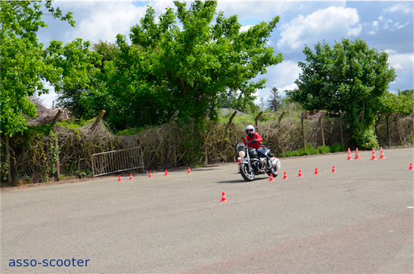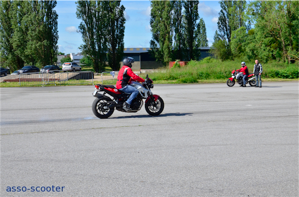 Les moniteurs sont là pour nous montrer qu’il est possible de s’aider du guidon et que la force gyroscopique fait que la moto se redressera toute seule à la fin de la manoeuvre.