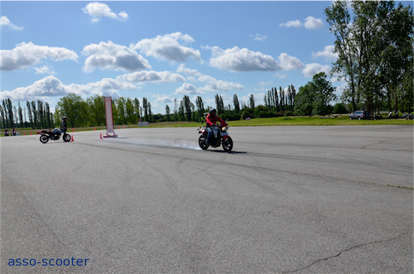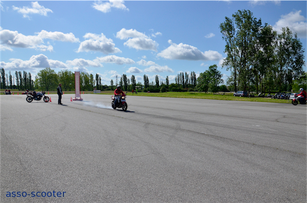 L’atelier se fait en deux temps. Le frein arrière est d’abord sollicité, freinage appuyé sur l’arrière uniquement. La roue se bloque mais si machine et homme sont bien dans l’axe, le deux roues poursuit sur sa trajectoire... dans un panache de gomme brulée.