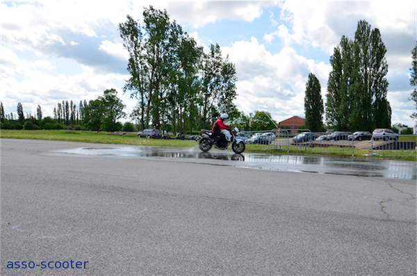 Pour cela, la piste est préalablement abondamment arrosée. C’est Bruno qui va nous montrer l’efficacité en passant à la vitesse de 100-110km/h et en freinant sur la zone mouillée. Aucun blocage de roues, nous entendons parfaitement les « tac-tac » du système qui relâche et reprend la pression sur les pistons. Tout cela se passe en quelques secondes. A la sortie de la zone mouillée, la F 800 R continue son freinage.