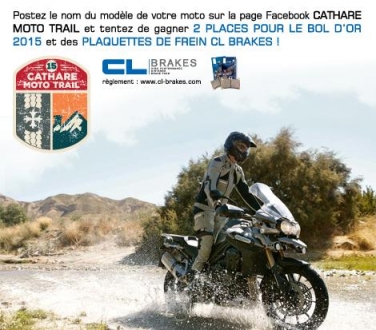 En effet, à l’occasion du lancement du Cathare Moto Trail les 27 et 28 juin 2015, CL Brakes fait gagner 1 billet valable pour 2 personnes pour le Bol d’Or 2015 et des plaquettes de frein CL Brakes pour votre moto !