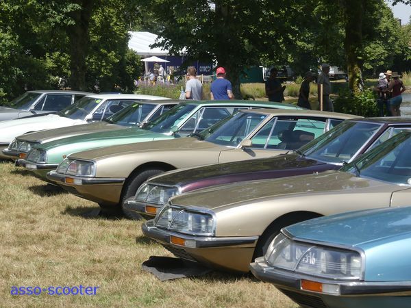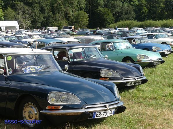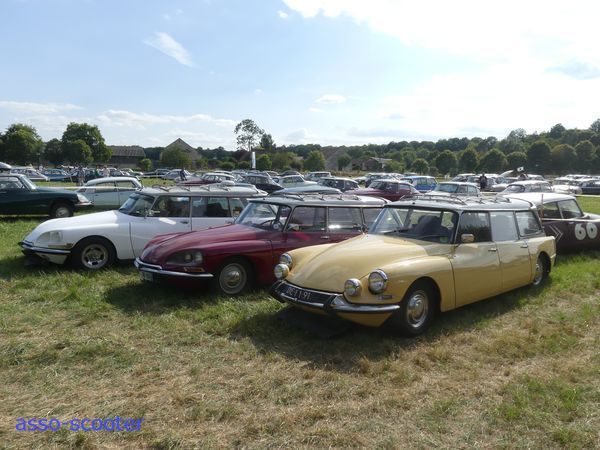 Nous continuons notre traversée dans le temps et revenons vers le château pour y découvrir sur tout le côté gauche du parc du château, les célèbres DS, 1955-1975, ont leur propre aire dédiée. Rangées au millimètre avec rigueur, berlines, coupés, décapotables, elles sont toutes là. Voiture devenue culte grâce au cinéma, elle a été présentée au salon de Paris de 1955 et 12.000 modèles sont commandés à la fin de la première journée. La DS a été vendue à presque 1.5 millions d’exemplaires.