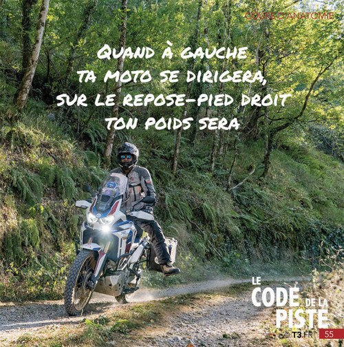 Vous y retrouverez de façon illustrée par Maéva Bardy et didactique toute cette expérience, partagée, avec des conseils, méthodes et exercices pleins de bon sens. Dans le Code de la piste, on ne parle pas de cross, de trial ou d’enduro, mais bel et bien de technique et philosophie pour voyager en maxitrail sur toutes sortes de pistes et chemins non asphaltés.