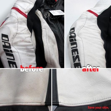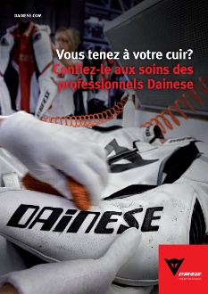 Car du 24 novembre au 31 décembre 2014, Dainese entretient votre cuir et ce, dans les règles de l’art. Pour votre blouson, il ne vous en coutera que 69€ et pour votre combinaison, le forfait est de 99€. Après cette opération entretien, votre cuir repartira et vous protégera pour quelques années encore.