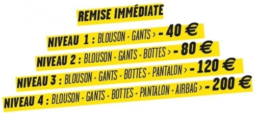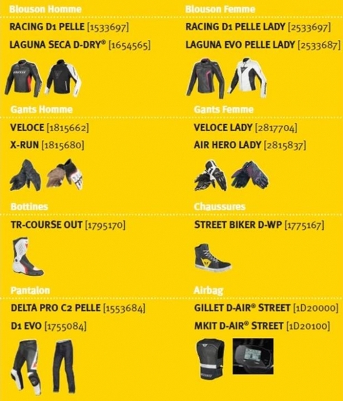 Durant cette opération, Dainese offre des réductions sur 14 produits, des gants Veloce jusqu’au gilet Airbag D-air. Les remises sont conséquentes, et fonction du pack acheté, de 40€ à 200€ !