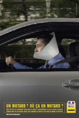 Ce visuel cherche à alerter les automobilistes du risque de ne pas se montrer suffisamment attentifs aux usagers de deux-roues motorisés. Un conducteur au volant d’une voiture porte une collerette.