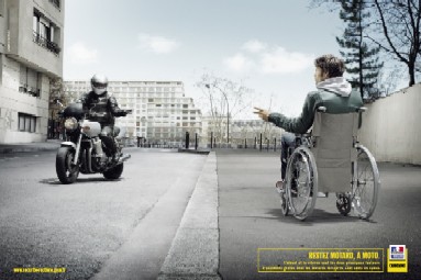 La plupart du temps, la pratique de la motocyclette est synonyme de plaisir, voire de passion. Un visuel met en scène un motard circulant sur la chaussée qui fait un signe de la main. Il croise une personne en fauteuil roulant sur le trottoir qui répond au motard en lui adressant un signe analogue.