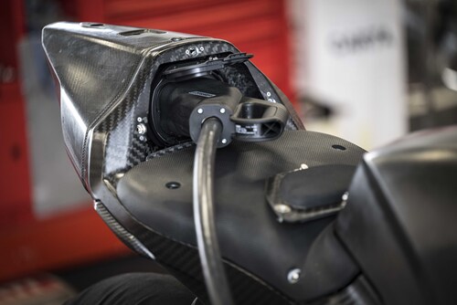 Le boîtier du pack batterie en fibre de carbone agit également comme une composante du châssis, comme c’est le cas pour le moteur de la Ducati Panigale V4, avec un cadre monocoque avant en aluminium qui pèse 3,7 kg.