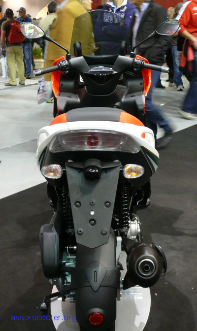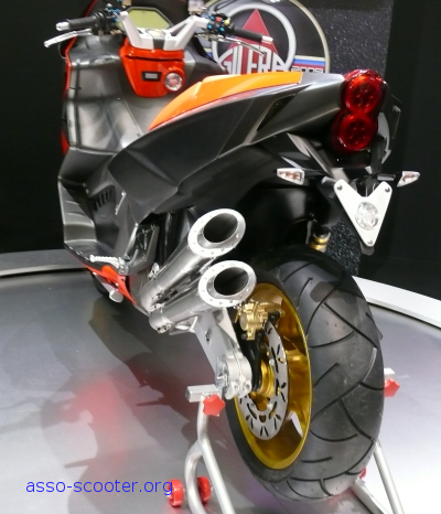 La taille des disques ayant été revus à la hausse, les maître-cylindres sont également revus en taille. L’ensemble Brembo est emprunté à l’Apprilia Tuono. Et si ce modèle se destine particulièrement à la course, comme son nom l’indique, il ne pourra prendre la route. Il n’a pas de feu avant.