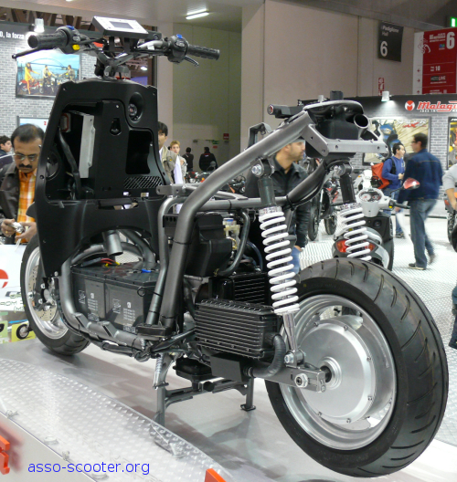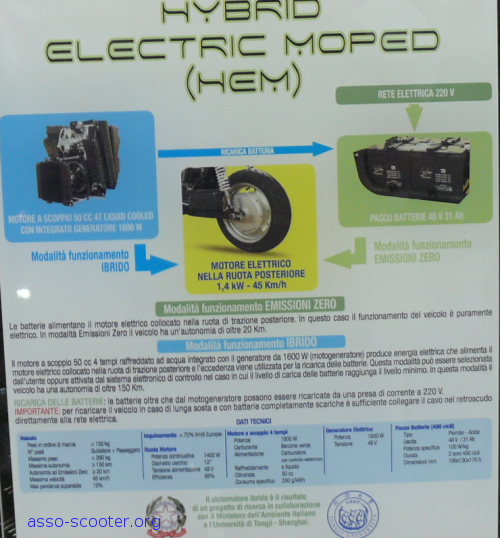 Et autre nouveauté sur le stand Malaguti de cette année, un scooter hydride, le Hem. A la différence de autres hydrides, c’est le moteur électrique de 1400W qui est le mode de propulsion principal. Le moteur thermique de 50cc, refroidissement liquide, va venir uniquement en secours pour recharger les batteries si celle-ci sont trop faibles en charge. Il est bien sur possible de les recharger avec le courant électrique. Les batteries au plomb( !) fournies par FAAM permettent au Hem de parcourir la distance de 20 km.