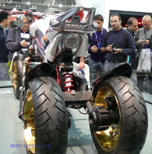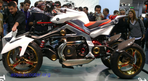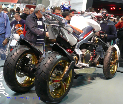 Yamaha présentait également à l’Eicma 2008 de Milan un prototype vu au salon de Tokyo. Il s ?’agit du Tesseract à... quatre roues. Rassurez-vous, il ne s’agit pas d’une auto mais bel et bien d’une moto. Le Tesseract est un véhicule hybride. Le moteur thermique est un V-twin et un moteur électrique vient le compléter. Et comme sur le Mp3, le pilote peut pencher le véhicule pour virer.