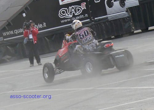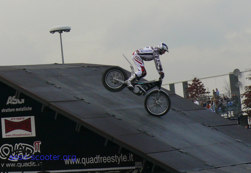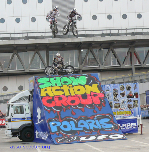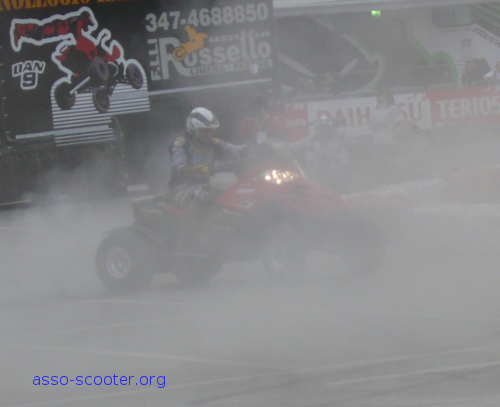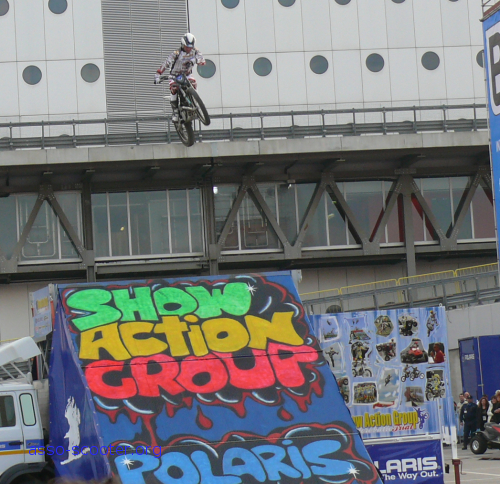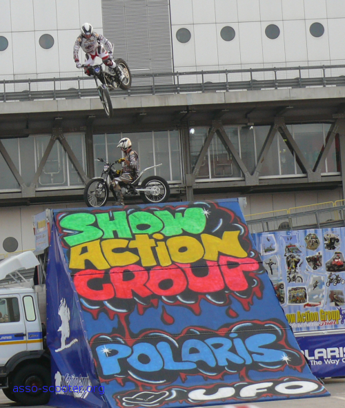Enfin, pour les animations à l’extérieur à l’Eicma 2008, le beau temps était avec nous et les cascadeurs n’avaient pour protection que leur talent et un simple casque. Les photos rendent difficilement l’ambiance bon enfant, les "gags", la poussière et l’odeur de pneumatique brulé.