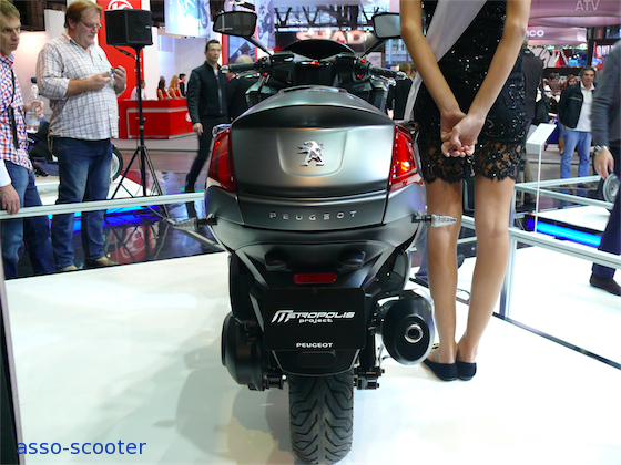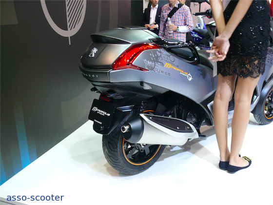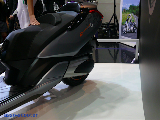 Peugeot, de salon en salon, affine son trois roues. Le Hymotion cette année gagne un avant qui rappelle l’ancien Elystar. L’arrière conserve un air de famille avec le Satelis. Le pot est nouveau, tout comme les poignées de maintien qui, pour une fois, méritent bien leur nom. Seule, leur couleur noir-brillant dénote par rapport au reste de la carrosserie. Cette nouvelle forme de pot préfigure-t-elle un nouveau moteur pour le Hymotion de Peugeot ? Au passage, nous apprenons que le Hymotion a aussi comme nom « P721 ».