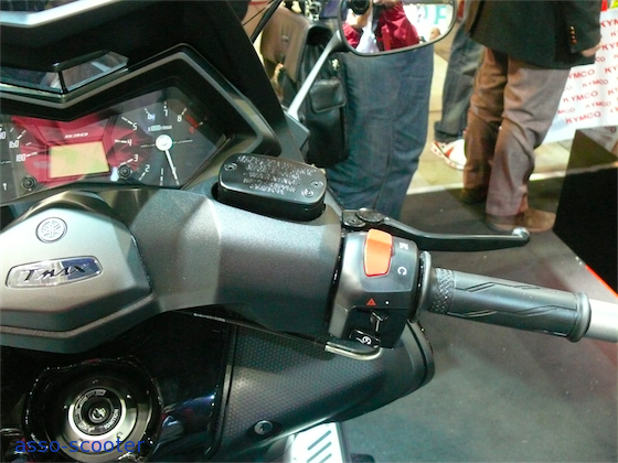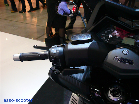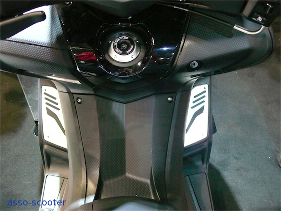 Sur le guidon, en son centre, un logo T-Max apparait. Au dessus des compteurs, une casquette vient les protéger. Celle-ci est percée de deux ouvertures.
