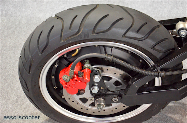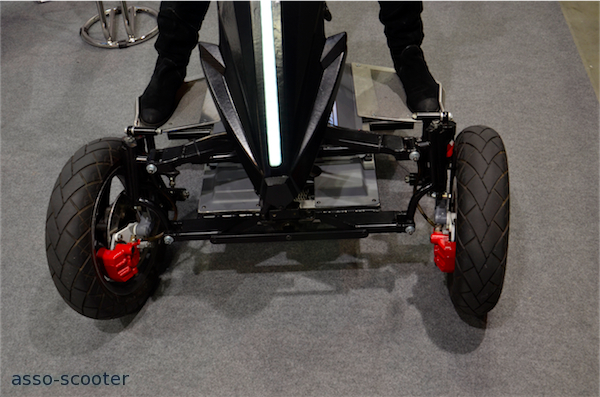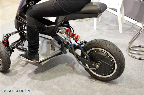 Le train avant est de type pendulaire. La batterie est placée sous les pieds du conducteur et le moteur est logé dans la roue arrière. Le moteur envisagé est de 5Kw,