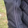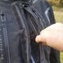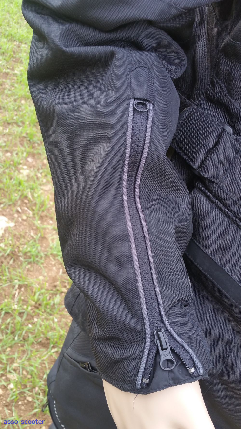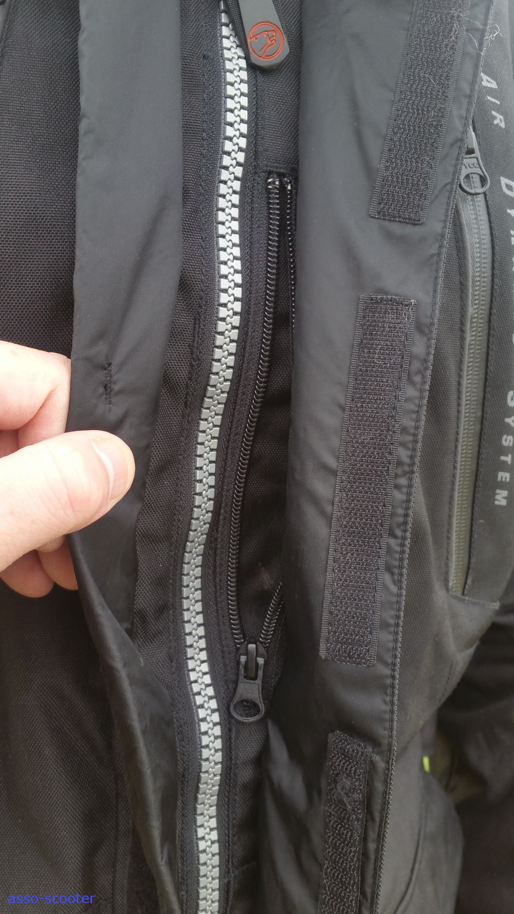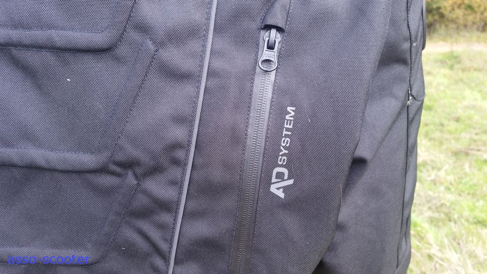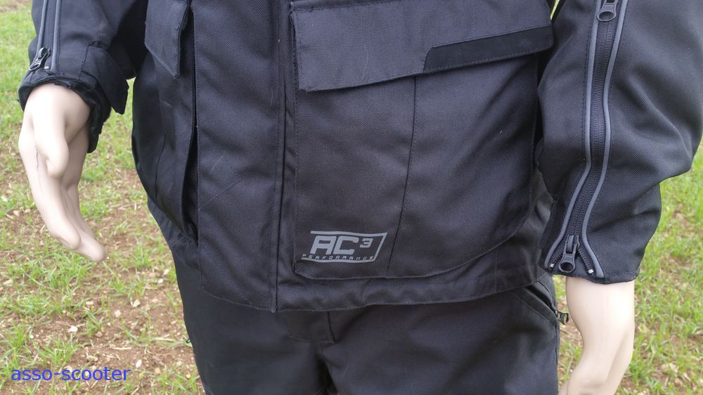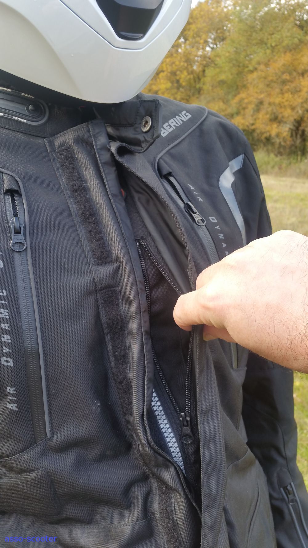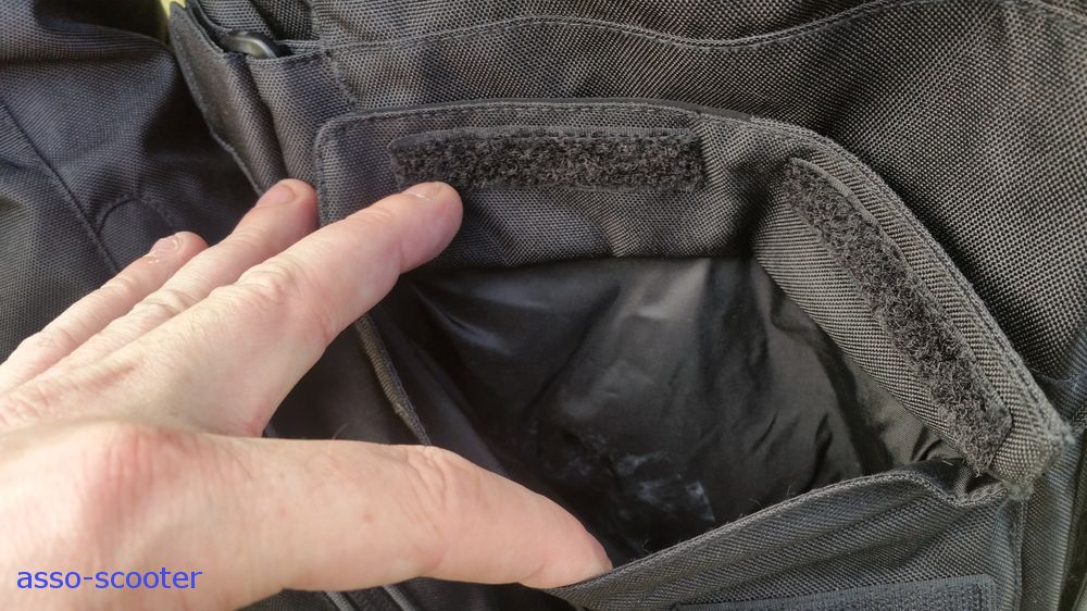 Il y a quatre poches en tout. Au niveau intérieur, une poche est placée au niveau de la poitrine à gauche entre la fermeture zippée et la doublure qui se ferme à l’aide de velcro. La doublure est pourvue d’une poche. La poche du blouson est un peu juste en profondeur. Une autre poche située au niveau des lombaires mais l’accès n’est pas très facile sans enlever la veste. Les deux poches extérieures sur les côtés sont assez larges et profondes pour contenir tout ce qui vous semble nécessaire pour une sortie scooter ou moto. Le contenu sera protégé de la pluie par les rabats des poches qui resteront en position fermé grâce au scrash.
