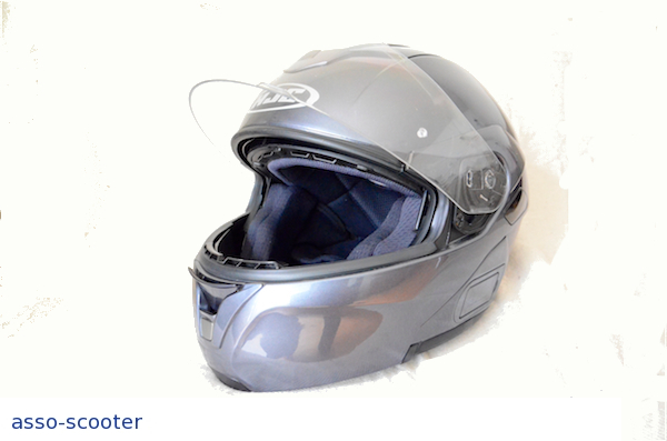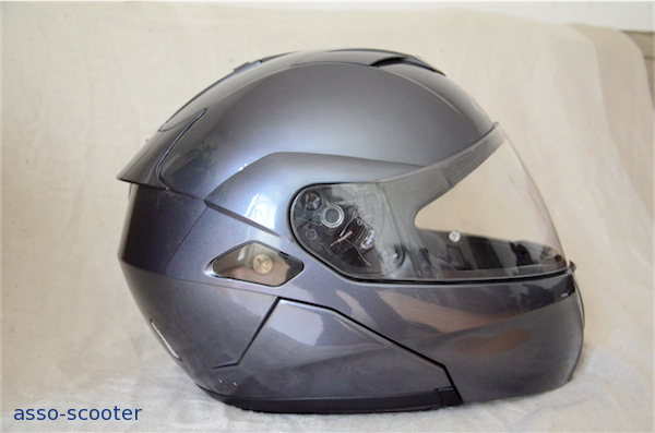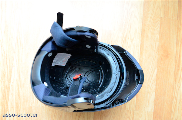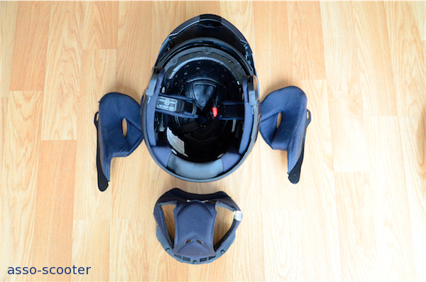 Sur la mentonnière, un volet bascule par aérer l’écran et une bavette est livrée. La sangle est micro-ajustable avec dégraffache rapide et ses formes régulières vous permettront de le loger dans le coffre de votre scooter.